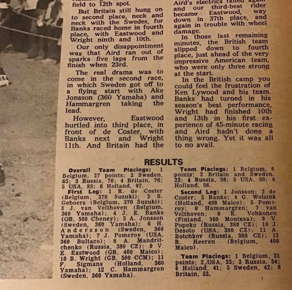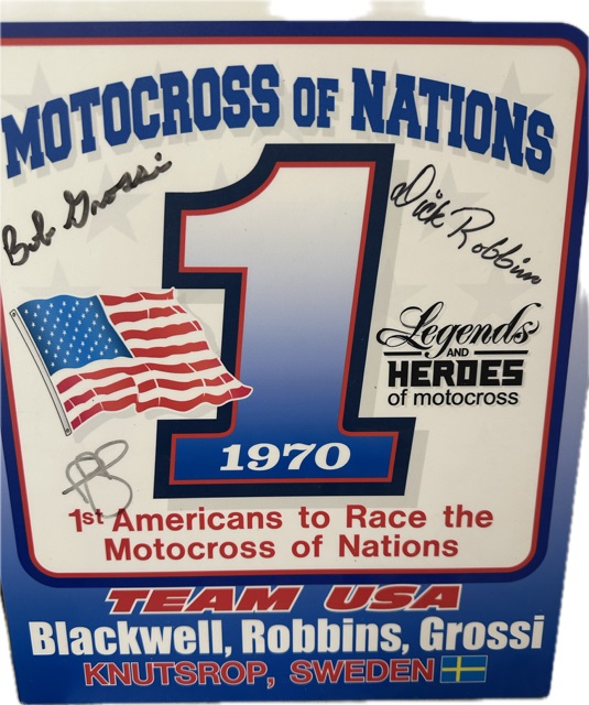 Mark Blackwell (membre de la première équipe américaine au Trophée des Nations en 1970) : " J'ai eu la chance de faire partie de la toute première équipe jamais constituée par les Etats-Unis pour participer a l'épreuve des Nations a Knutstorp. Auparavant, il y avait le Trophée des Nations pour les 250cc et le Motocross pour les 500cc. Il y avait deux épreuves séparées d'une ou deux semaines d'intervalle a la fin des saisons de Grand Prix. En 1970, j'avais seize ans quand Edison Dye m'a envoyé en Suède pour disputer quelques courses et apprendre a rouler. Et a mon retour, il m'a demandé si je voulais retourner en Suède, je lui ai demandé pourquoi et il m'a dit : " qu'il y avait une grosse course appelée Trophée des Nations, et je vais y envoyer une équipe. Je n'ai pas encore toute l'équipe. Il y a toi et peut-être Bob Grossi. Je n'ai pas encore le troisième pilote, mais, que ton passeport soit prêt, et toi aussi sois prêt a partir. Il se peut que dans deux-trois jours tu partes." Le troisième pilote fut Dick Robbins. Et nous sommes partis ! Ce fut une course boueuse et nous n'avons pas très bien roulé. Je ne me souviens pas de nos résultats. (ndl'a : M.Blackwell 19ème, D.Robbins 24ème, B.Grossi DNF). Ce fut un grand honneur, cette sélection, même si je ne m'en suis pas rendu compte a l'époque, j'avais juste 17 ans. Je me souviens qu'il y avait beaucoup de couleurs, des drapeaux, un niveau de compétences, des top pilotes et aussi que les pilotes européens étaient intrigués de notre venue : " Etes-vous vraiment les meilleurs pilotes américains ? " Ils s"étaient peut-être un peu moqués de nous, mais ils nous avaient super bien accueillis. "