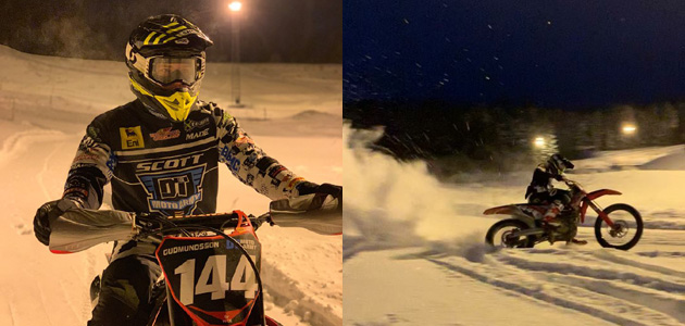 Ce n'est pas monnaie courante, essayons donc d'en savoir un petit peu plus : Andri nous éclaire : "Comme le sol est gelé et dur, les sauts et les ornières sont vraiment difficiles. Nous utilisons donc des pneus cloutés avec des vis, pour une meilleure adhérence sur la glace. Les réglages de la moto sont plus souples que sur la terre. J'essaie de rouler trois fois par semaine, mais il fait froid ! Cependant, c'est nécessaire car cela me maintient en forme. Je roule pendant 30,40 ou 60 minutes, cela dépend des sessions. J'essaie de garder un pilotage souple et de corriger mes erreurs. C'est dur de réaliser des sessions intenses quand c'est très glissant. Je vis et m'entraîne en Norvège, car il y a de meilleures facilités qu'en Islande et le championnat est plus relevé. Même si la nuit tombe vite, certains circuits sont bien équipés avec des éclairages, comme celui de Lier" !